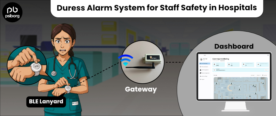 PsiBorg successfully developed and delivered an advanced staff safety solution customised for hospitals. Our expertise in developing tracking and monitoring solutions and IoT in healthcare solutions enabled us to design a system that ensures rapid emergency response through real-time location tracking and instant duress alarm activation.